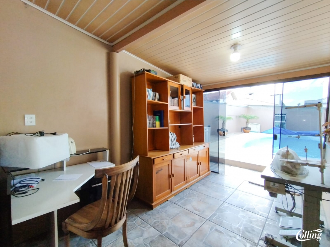 CASA PRINCIPAL DE ALVENARIA: dois dormitórios, banheiro social, sala de estar, cozinha, área de serviço, despensa, garagem coberta para dois automóveis. Quiosque com pia, churrasqueira, banheiro social e uma sala de leitura próximo da piscina.