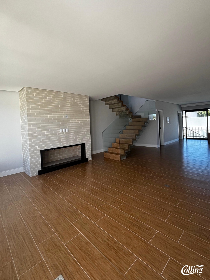 A área social integra sala de estar com lareira à cozinha em conceito aberto, criando um ambiente amplo. A área gourmet coberta amplia essa experiência, proporcionando um espaço perfeito para receber com requinte.
